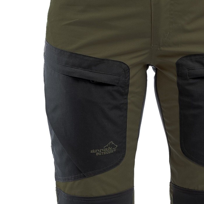 Byxan är tillverkad i en slitstark polyester/bomullsblandning och har DWR-behandlade stretchpaneler som står emot väta. Nertill är den förstärkt för extra hållbarhet och försedd med justerbara benslut och kängkrok, perfekt för att få en tajt passform över kängorna.