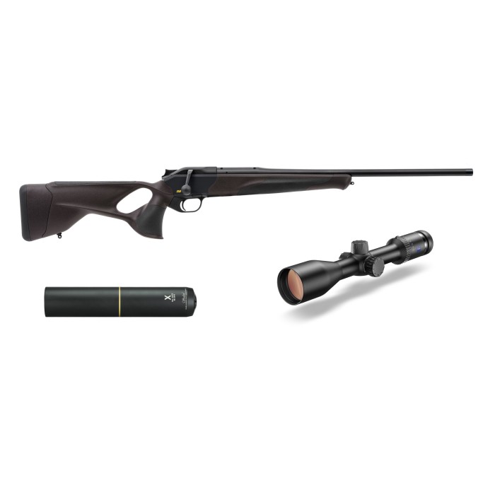 I paketet ingår Carl Zeiss Conquest V6 2-12x50 ASV, ett kikarsikte byggt och designat för jakt på korta och medellånga håll samt vakjakt såsom älgjakt, bock, gris, toppfågel eller bäver. Stalon X108 ljuddämpare minskar både ljud och rekyl effektivt, med sin lätta teleskopiska design och hög prestanda. Blasers sadelmontage ingång och är en perfekt förbindelse mellan vapen och kikarsikte.