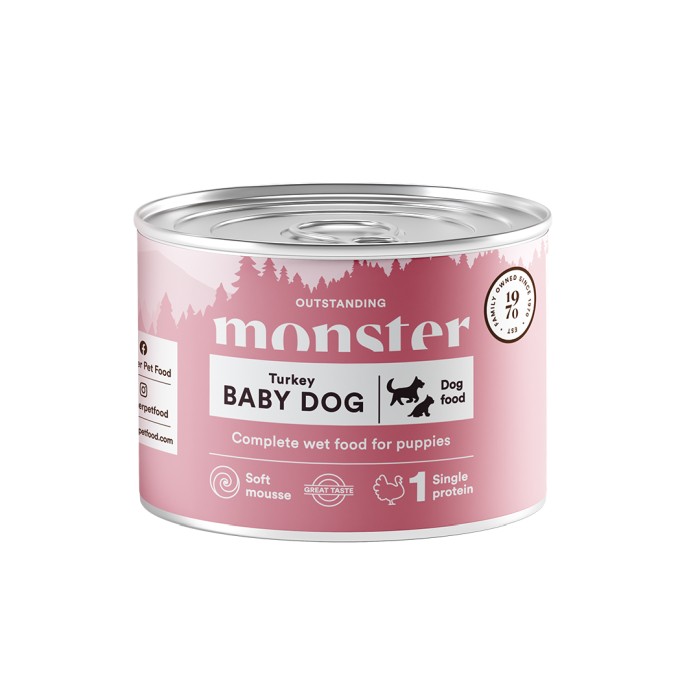 Monster Baby Dog Mousse är en mjuk och välsmakande valpmat, särskilt framtagen för att vara skonsam mot valpens känsliga mage. Med kalkon som enda proteinkälla och en silkeslen mousse-konsistens är den idealisk för att introducera fast föda. Den balanserade sammansättningen stödjer både tillväxt och utveckling under valpens första levnadstid – från avvänjning till vuxen ålder. Fri från onödiga tillsatser och full med näring som din valp behöver för en trygg och hälsosam start i livet.