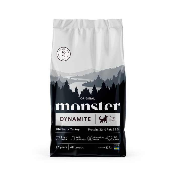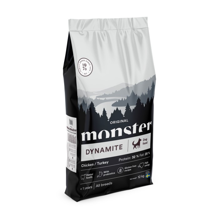 De mest högpresterande hundarna behöver ett foder som maximalt tillgodoser deras ökade energibehov. Monster Dynamite är ett foder som klarar kroppens enorma påfrestningar, är schysst mot magen och som hjälper din hund att nå sin fulla kapacitet. Ja, som gör din hund till ren dynamit helt enkelt.