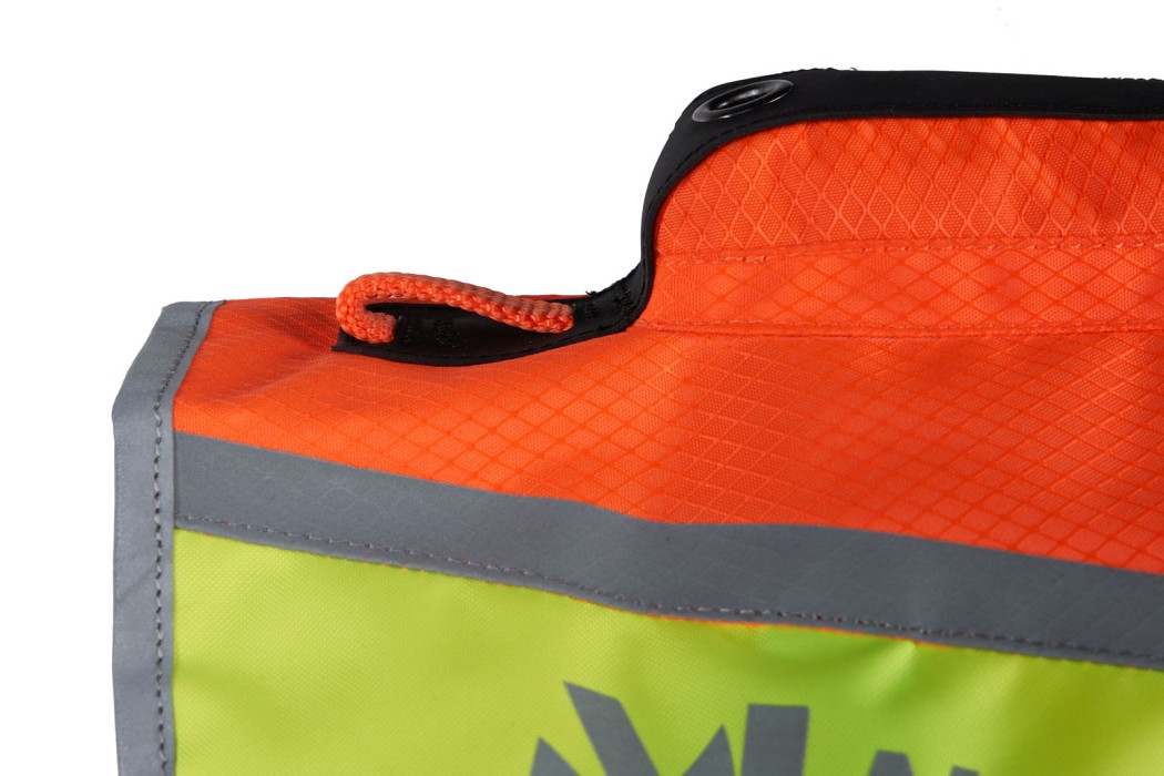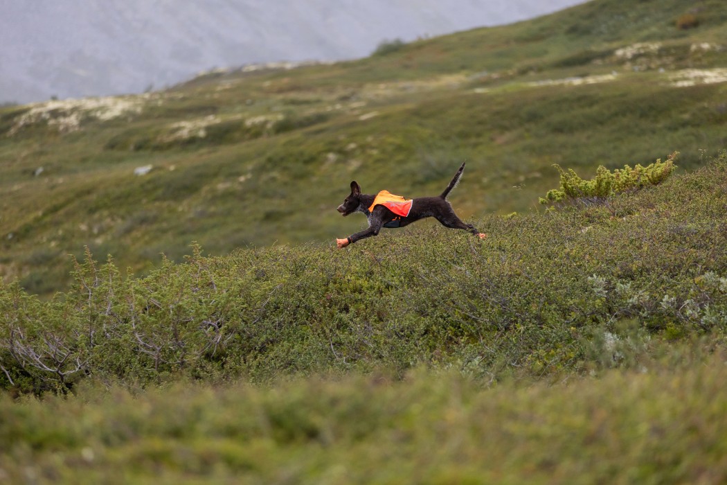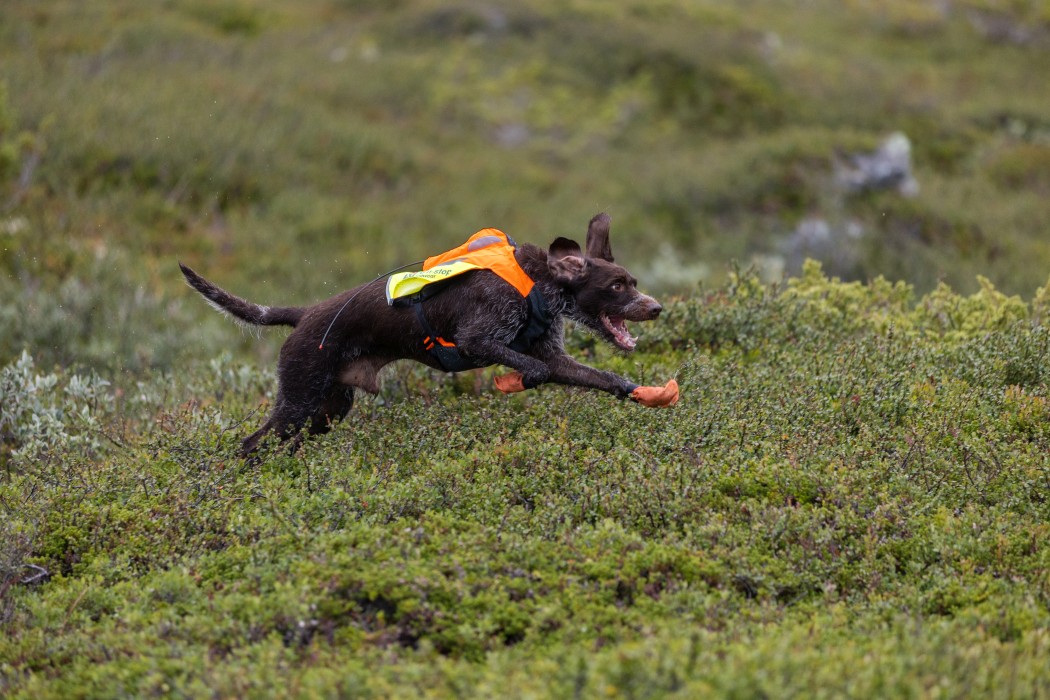 Den klara orange färgen och reflexdetaljer gör hunden lätt att upptäcka även i svagt ljus. På orange-versionen finns dessutom röda och gula kontrastpaneler som visar åt vilket håll hunden rör sig, en uppskattad funktion vid spårning. Västen har justerbar passform och spännen som är integrerade i sidopanelerna för att minska risken att fastna.