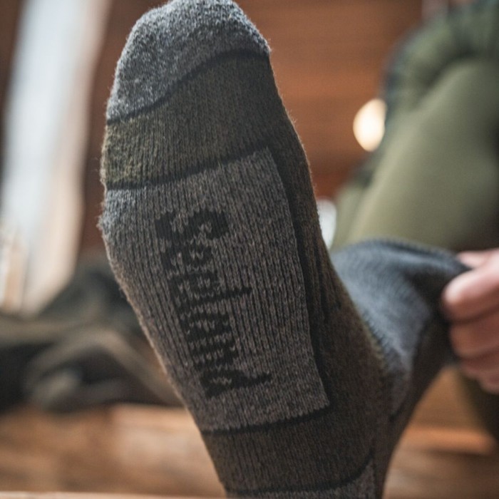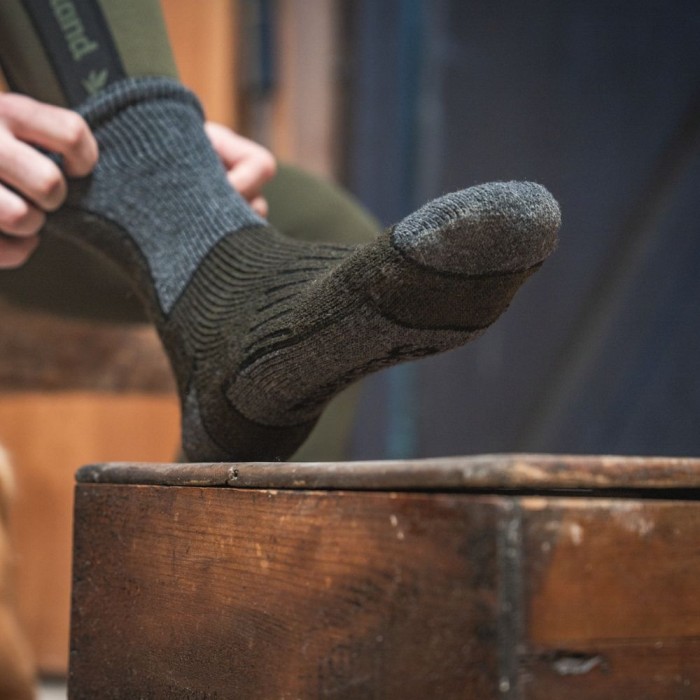 Kalla fötter hör inte hemma på jakten. Seeland Field Thermo är ett par högpresterande jaktstrumpor som levereras i ett praktiskt 2-pack, perfekta för dig som spenderar långa dagar i kall terräng. Strumporna är tillverkade i en slitstark och värmeisolerande mix av polyester, akryl och ull, med frottéfoder som ger extra värme och komfort. Den ventilerande materialblandningen transporterar bort fukt och torkar snabbt, vilket håller fötterna torra även vid hög aktivitet. Med platta tåsömmar som motverkar skav, hålfotsstöd och ett kompressionsband som håller strumpan på plats, får du ett plagg som sitter där det ska, hela dagen.